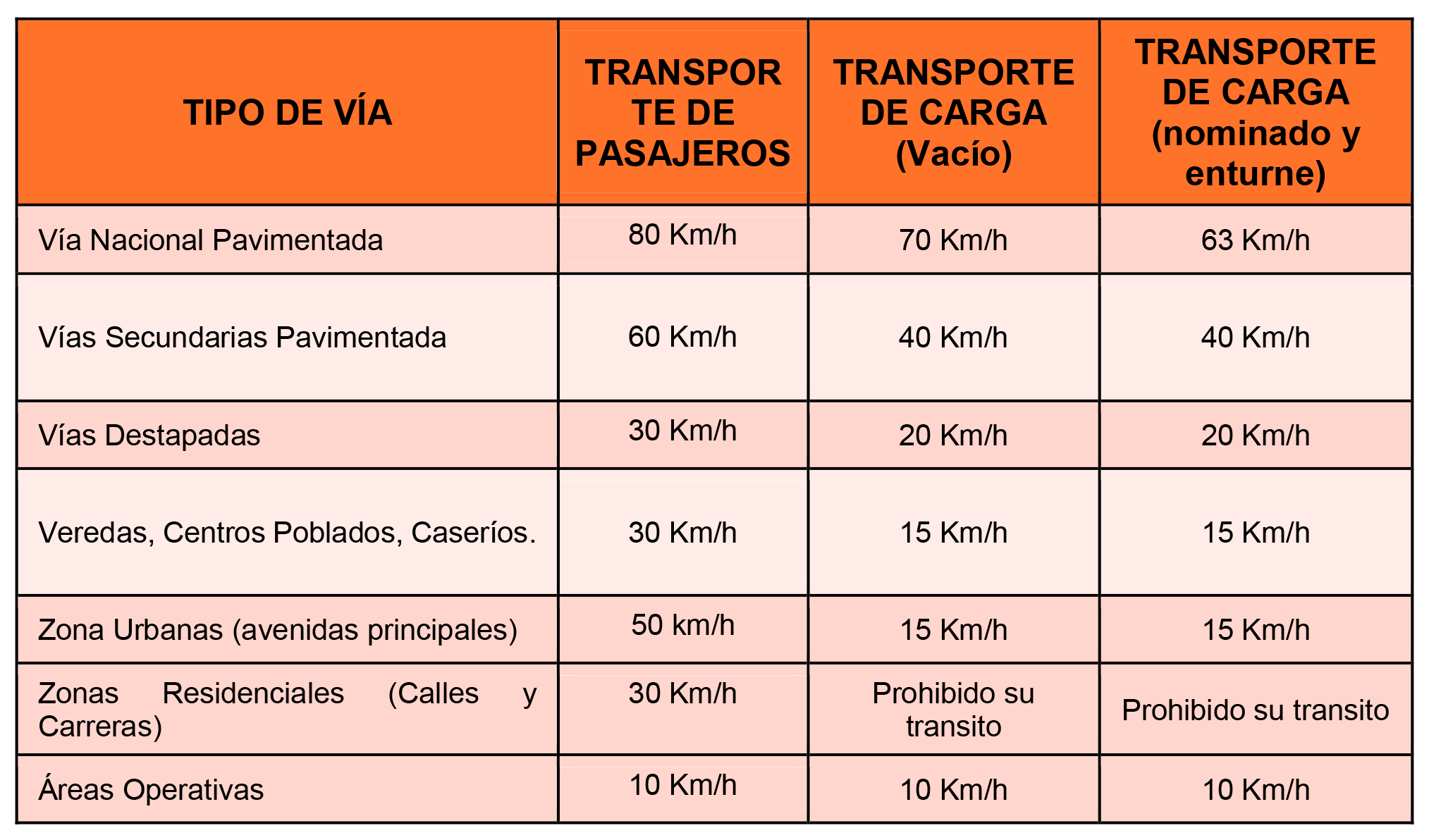 ● Se cumplirá con la regulación vigente en materia de velocidades permitidas en las vías nacionales y al interior de las instalaciones de los clientes, de la siguiente manera:
